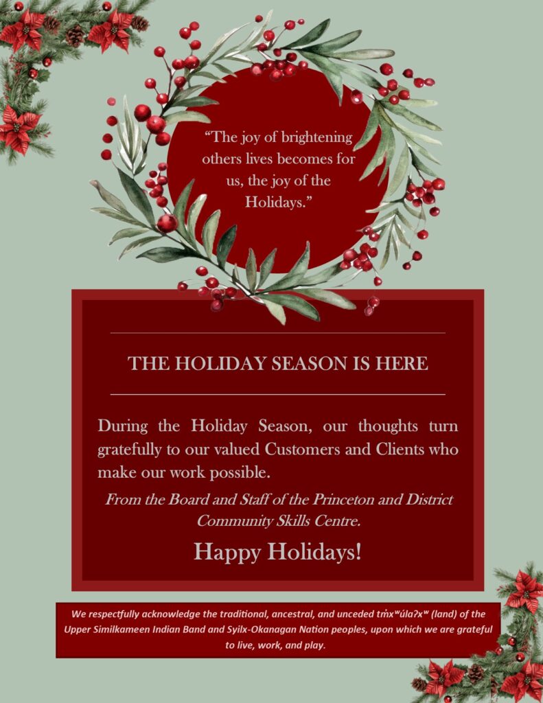 Holiday Hours for the Princeton & District Community Skills Centre and WorkBC Centre